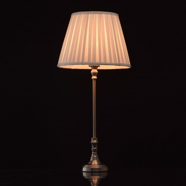 Элегантная настольная лампа из коллекции «Салон» подчеркнет отменный вкус своего обладателя. Металлическое основание выполнено в трех цветовых вариациях: античная бронза, античная медь и сатиновый никель. Под стать изящной высокой ножке – легкие тканевые гофрированные абажуры. Они выполнены в двух классических оттенках: белом и чёрном.